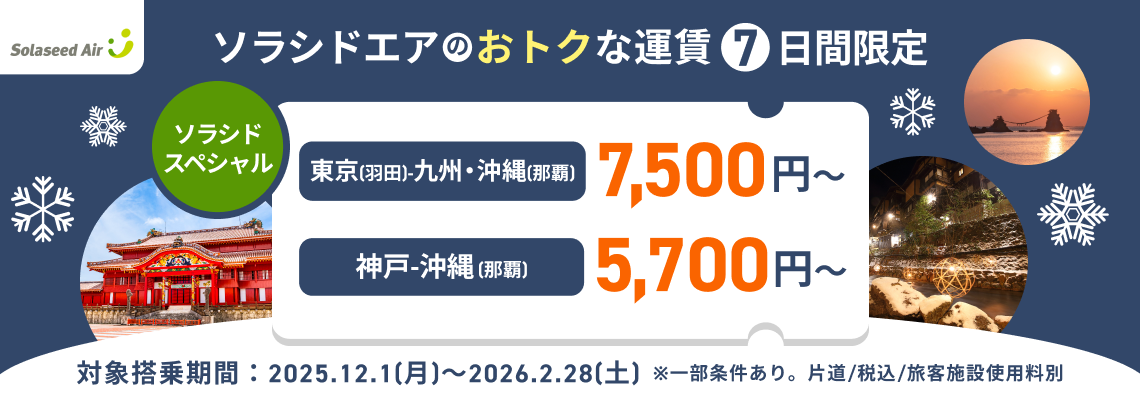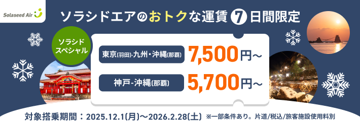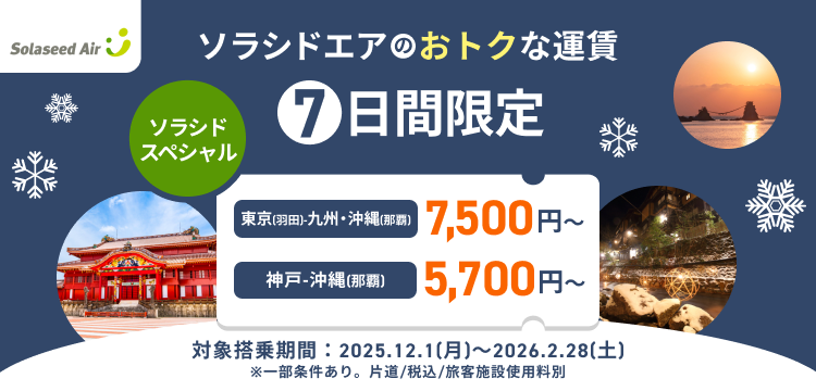 - 2025年10月17日(金)から、12月~2月ご搭乗分が対象のおトクな運賃「ソラシドスペシャル」を販売いたします。