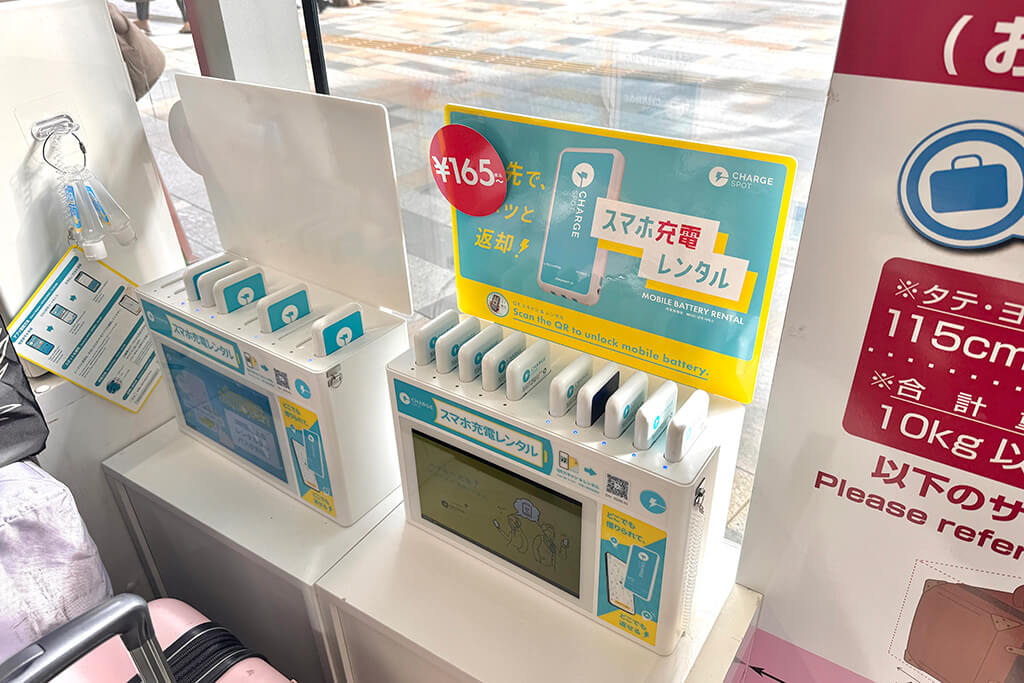 ターミナル内の待合室、自動券売機付近には、有料の携帯充電スポットが用意されています。急にスマホの電池切れが起きたときも、安心です。
