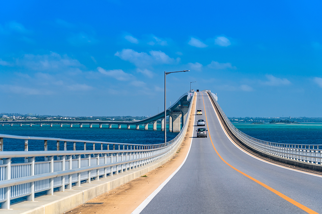 宮古島と伊良部島を結ぶ伊良部大橋は、全長3,540mにも及ぶ無料で渡れる橋としては日本最長を誇ります。橋の上から見渡すエメラルドグリーンからコバルトブルーへと変化する海のグラデーションは圧巻で、宮古ブルーの魅力を存分に感じることができます。遮るものが何もないため、開放感あふれるドライブを楽しめ、夕暮れ時にはロマンチックな夕日スポットとしても人気があります。