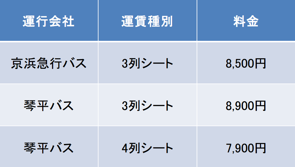 東京-徳島間では、京浜急行バス、琴平バスの高速バスが運行しています。次の表は東京-徳島間の高速バスの料金をまとめたものです。